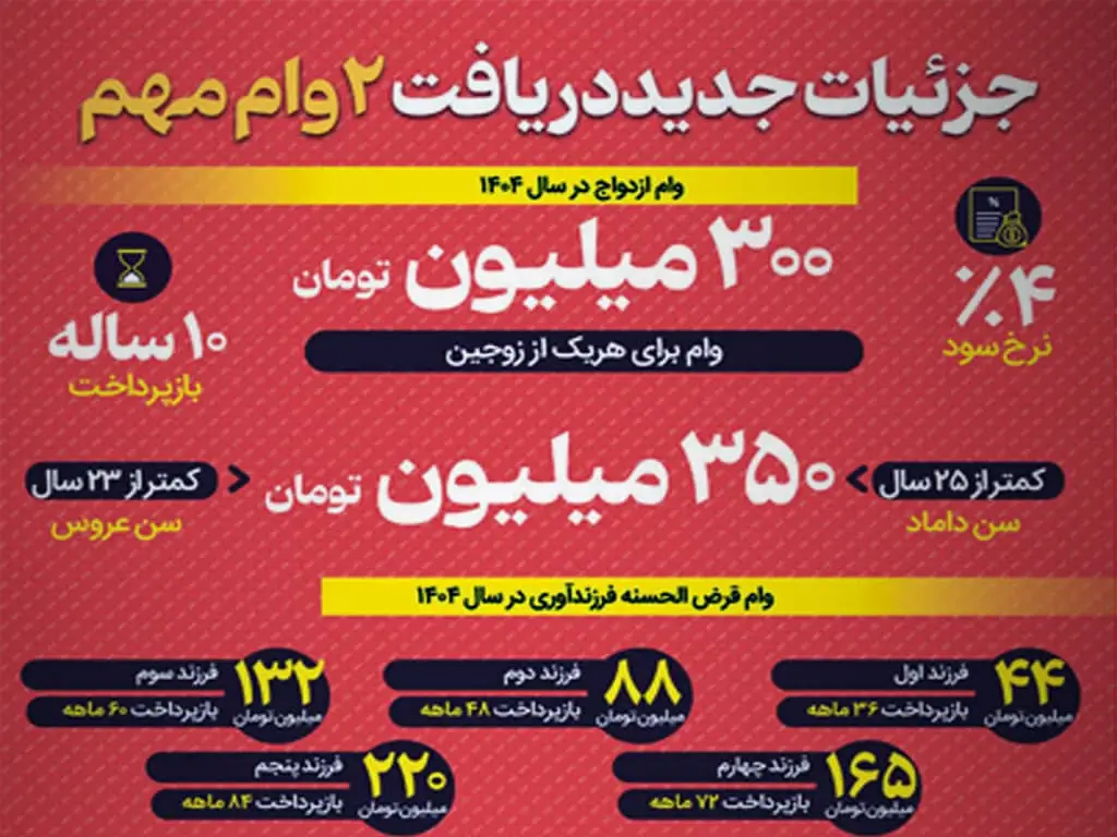 • جزئیات دریافت وام فرزندآوری و ازدواج در سال ۱۴۰۴ به صورت زیر میباشد.