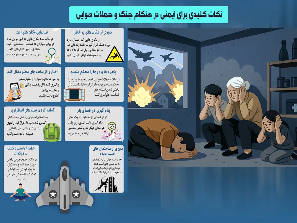 • نکات کلیدی برای ایمنی در هنگام جنگ و حملات هوایی در اینفو گرافیک زیر مشاهده کنید.